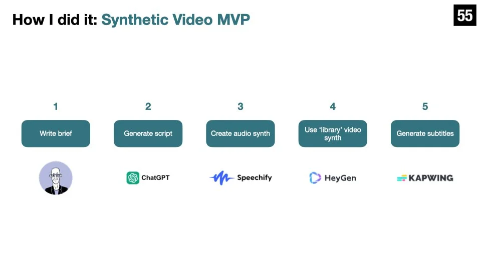 First stop was identifying a topic - in this case, I chose the work that 55BirchStreet is doing with generative AI for our clients. I fed in a prompt to ChatGPT explaining what I wanted, and got a pretty decent script back straight away.